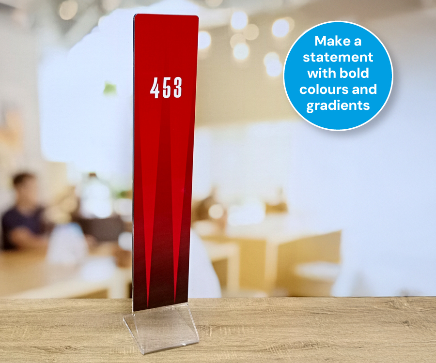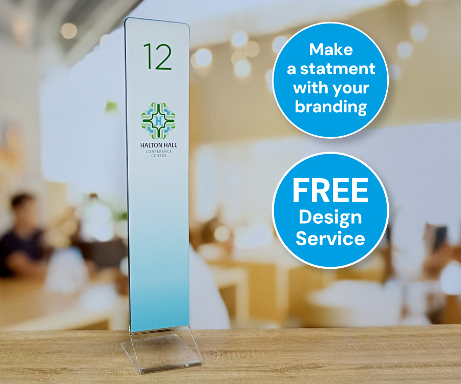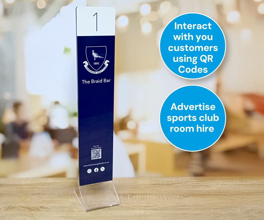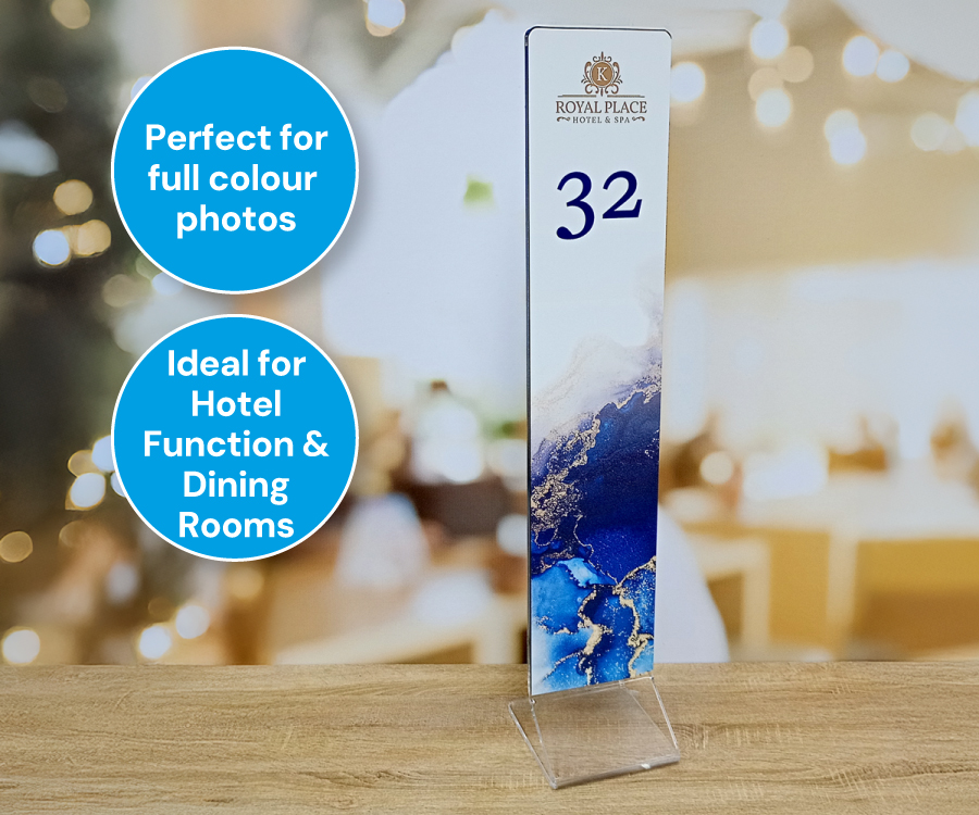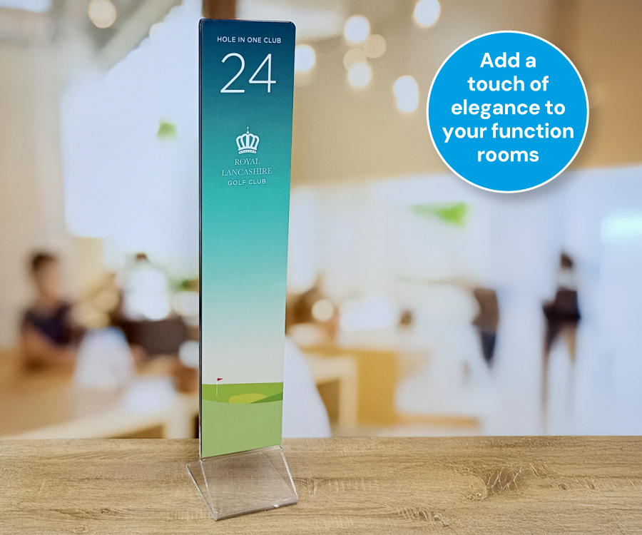 Personalise these table numbers with your own full colour design, adding your corporate identity in your brand colours and style, add photos and QR codes to enhance your design further. These contemporary table numbers are a popular choice for Rugby Clubs, Football Clubs, Golf and Cricket Clubs, Hotels, Banqueting Suites and Function Rooms. Their versatility also makes them ideal for Cafés, Bars & Restaurants. Our space saving design allows them to be stacked neatly and stored away after use.