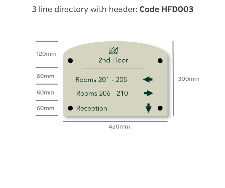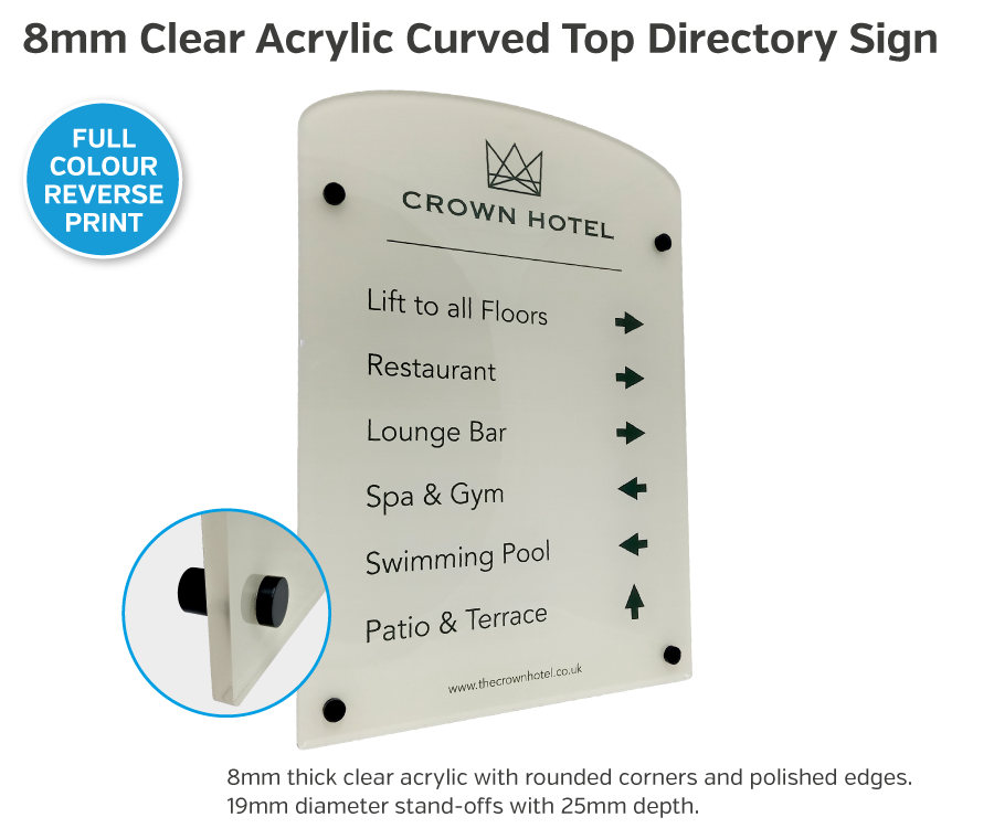 Laser cut from hard-wearing 8mm thick crystal clear acrylic and backed with a vivid full colour print, our hotel floor directory and room directional signs are perfect for hotels, guest houses or leisure complexes. Complete with your choice of polished silver, polished gold or satin black wall-mount stand-offs as standard. Other stand-off colours are available on request. Contact the office for details.