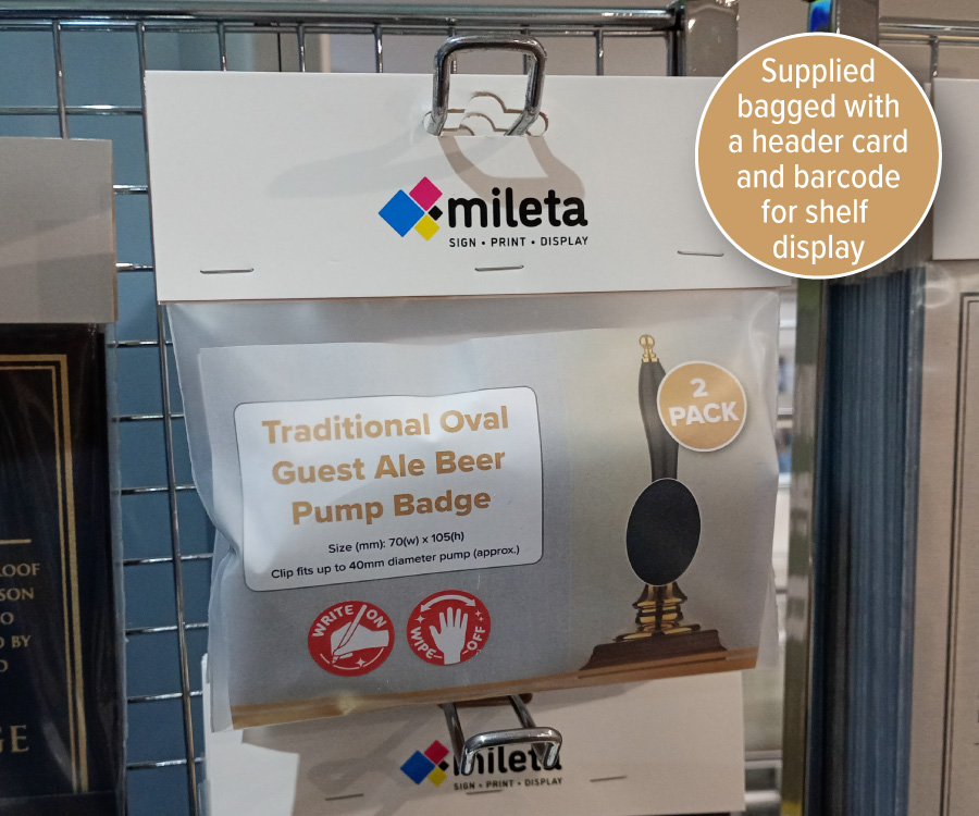 Sold in packs of 2 and made from durable 3mm Matt Black acrylic, these bar pump badges are ideal for busy pubs and bars that frequently have guest ales and beers on offer. Suitable for use with liquid chalk pens, the surface of the badge provides an smooth surface to write on and promote your beer! Supplied with a self-adhesive plastic clip that fits round pump handles up to 40mm in diameter (approx).