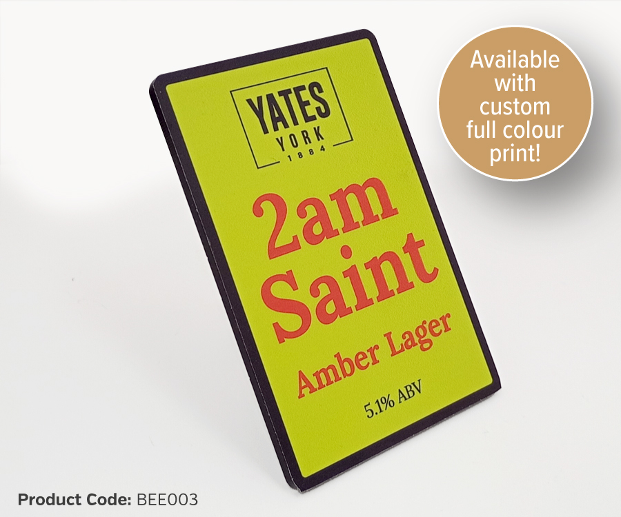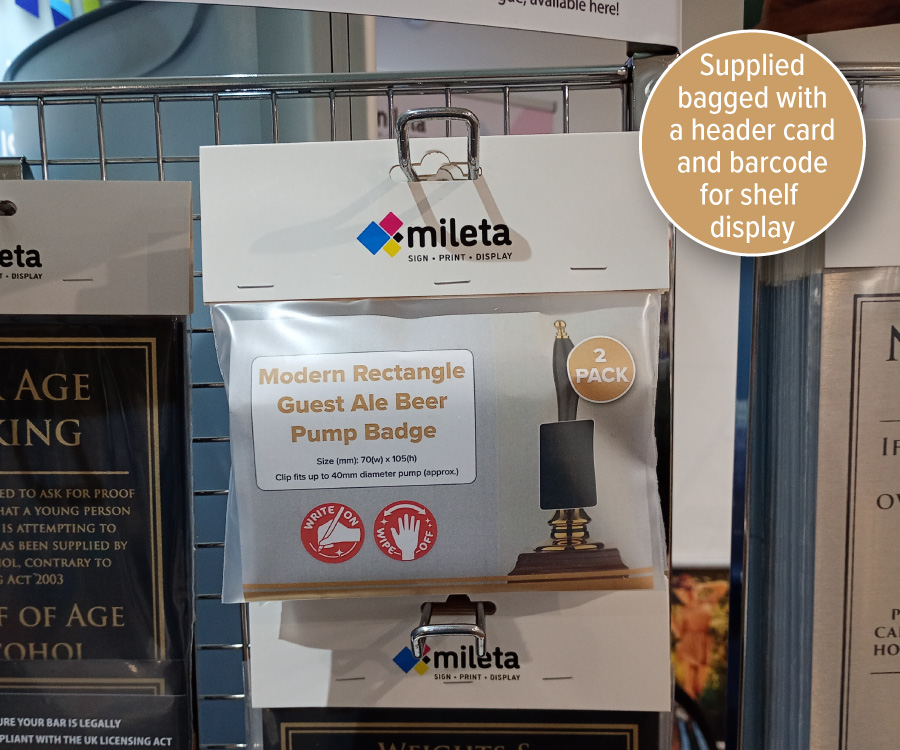 Sold in packs of 2 and made from durable 3mm Matt Black acrylic, these bar pump badges are ideal for busy pubs and bars that frequently have guest ales and beers on offer. Suitable for use with liquid chalk pens, the surface of the badge provides an smooth surface to write on and promote your beer! Supplied with a self-adhesive plastic clip that fits round pump handles up to 40mm in diameter (approx).