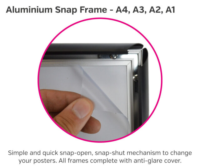 A durable and dependable poster frame system. Our snap frames are made to last in busy environments, with a great finish, strong springs and mitred corners. You’re spoiled for choice as well, with poster sizes from A4 up to A1.