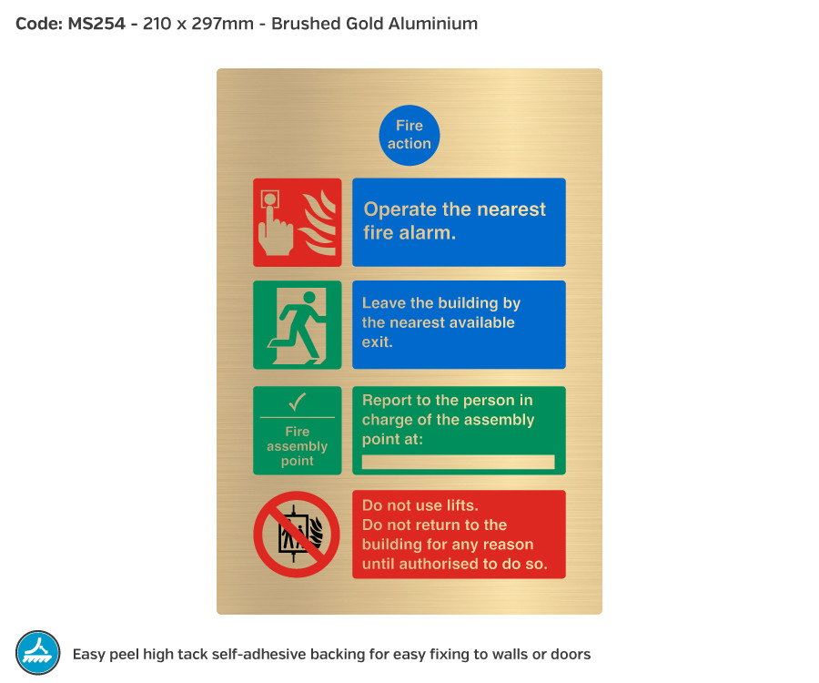 Our premium material helps ensure you meet your Fire Action notice requirements, whilst maintaining a professional image to both staff and visitors alike. Our range of Brushed Gold or Silver Fire Action notices are printed on 0.7mm aluminium and look fantastic in more prestigious locations.